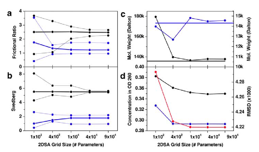 The 2DSA is a very robust method. Additonal degenergy was introduced when the resolution of the grid was increased but it did not degrade the solutions reliability.