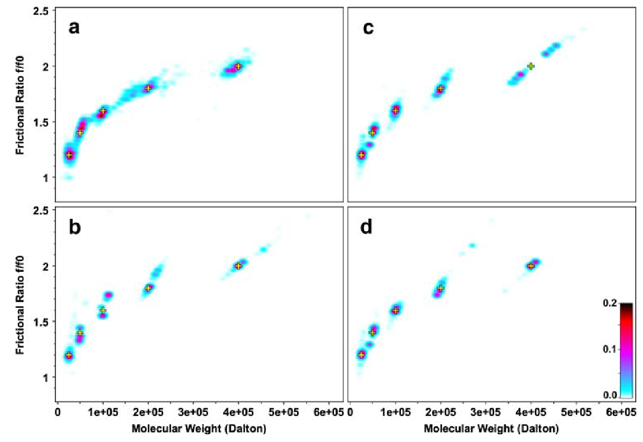 At the low resolution, the composition is porrly defined and the solute peaks are split. At higher resolutions, both species are well defined into narrow regions. Noise contributions are well seperated and idenifiable by the upper frictional ratio fitting limit (\(k=f/f_{0}\)=4). The color scale represents the signal of each species in optical density units.