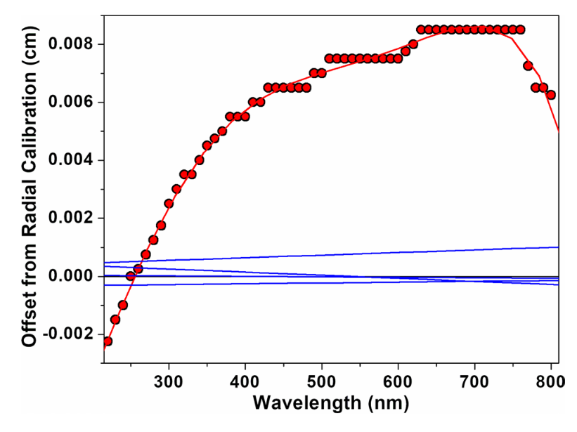 RED: deviation from the radial calibration at 250 nm for four averaged meniscus positions. Data is fitted to a 5-th order polynomial.