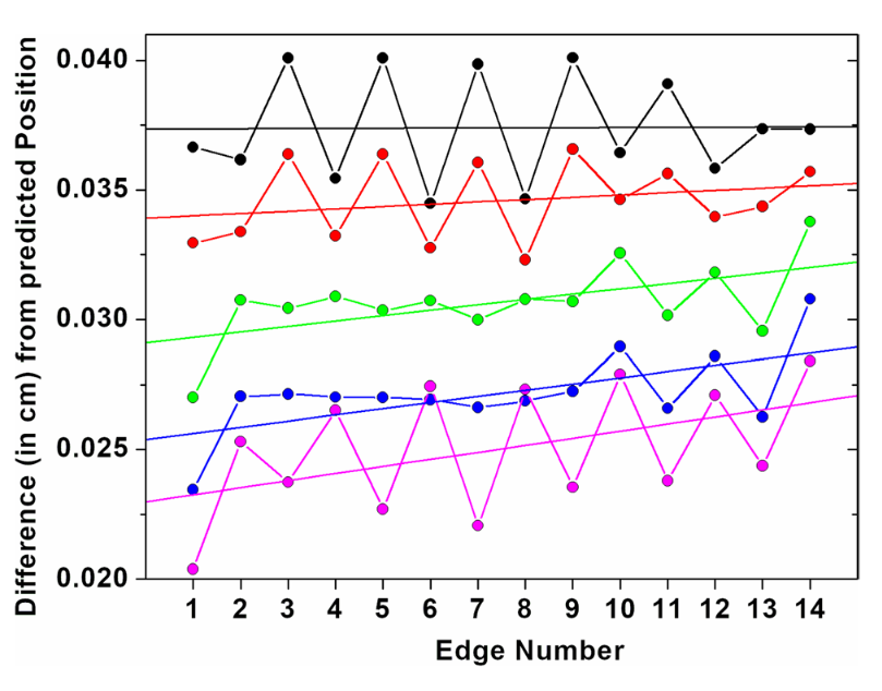 \(\textbf{Figure 1}\) Edge position deviaitions from predicted positions for observations made at: 200 nm (black), 230 nm (red), 300 nm (green), 460 nm (blue), and 750 nm (magenta).