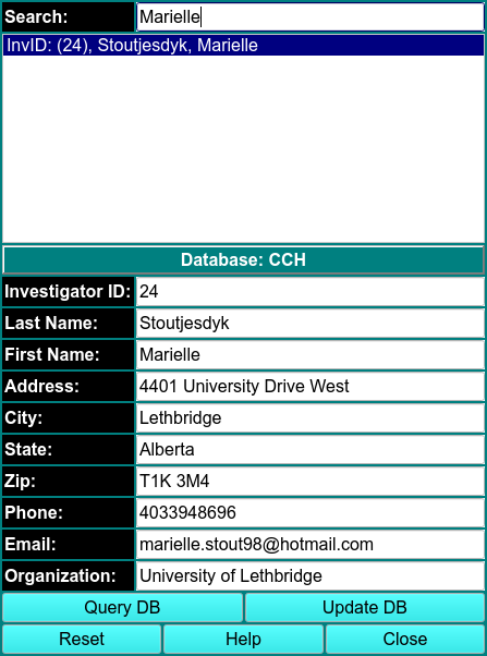 Use \(\textbf{Accept}\) to pass the information back to the calling program and close this dialog or \(\textbf{Cancel}\) to simply close without changing the investigator data.