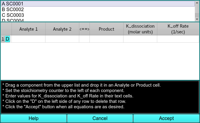 Each associaton row is built by dragging a model component in the upper list to an Analyte or Product cell.As each analyte is dropped, its code letter (A, B, C, ...) appears in the cell with a subscript that represents the oligomer number of the molecule. At least one Analyte and one Product cell must be thus populated. The implied chemical equation must be balanced by setting the stoichiometry counter in each cell such that stoichiometry times oligomer value(s) on the left equals the product of stoichiometry and oligomer on the right. K_association and K_off Rate values should be entered for each row.