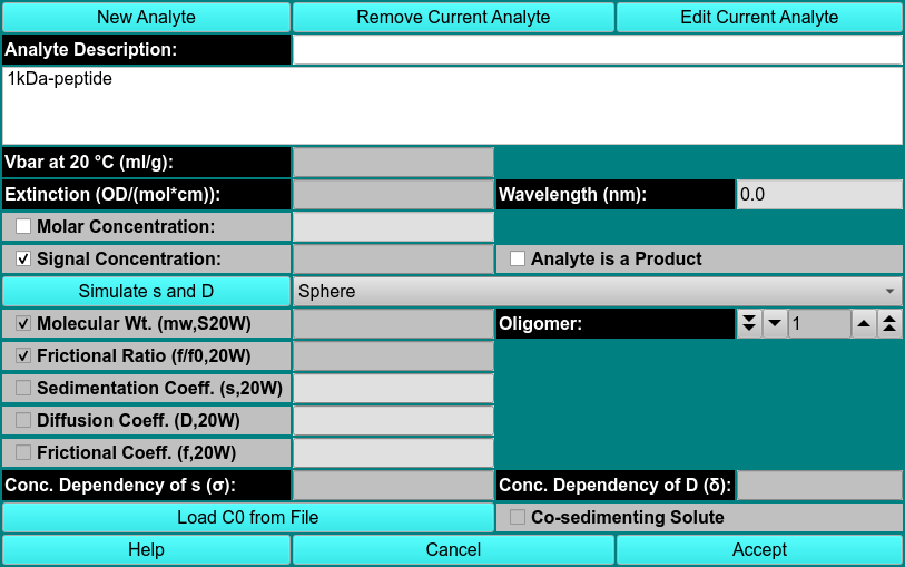 Exactly 2 of the 5 component parameters (molecular weight/oligomer, frictional ratio, sedimentation coefficient, diffusion coefficient, and frictional coefficient) should be checked and their values possibly modified. Values of the unchecked parameters are calculated from the two selected.