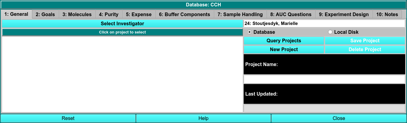 Using this window, you can manage project information on your local disk or in the current database. You must be identified as the investigator to delete or update a project description.