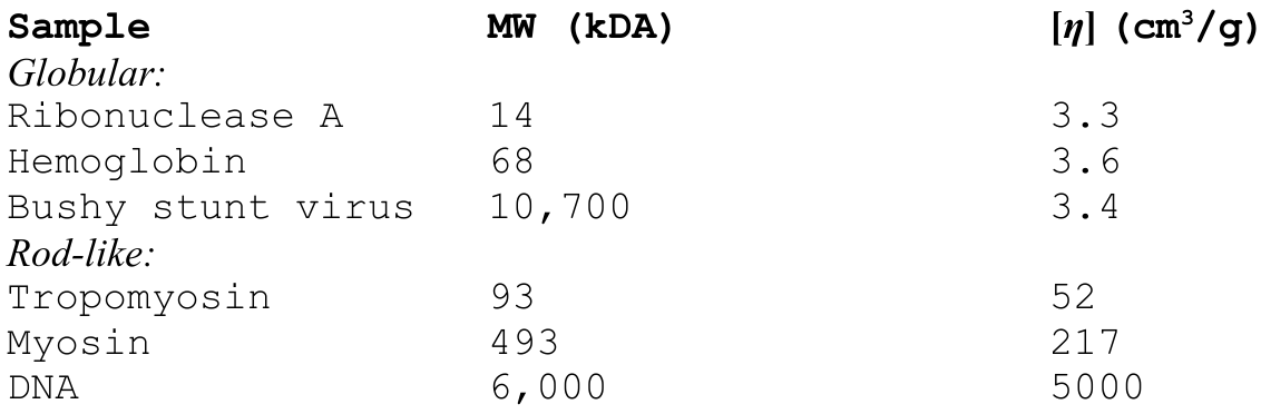 where \(V_{h}\) is the volume of the hydrated sphere, \(N_{A}\) is Avogadro's number, and \(M\) is the sphere's mass.We can see here that globular molecules of any size will have the same approximate intrinsic viscosity. Rod-like molcules, on the other hand, can have massive intrinsic viscosities. Consider the table below.