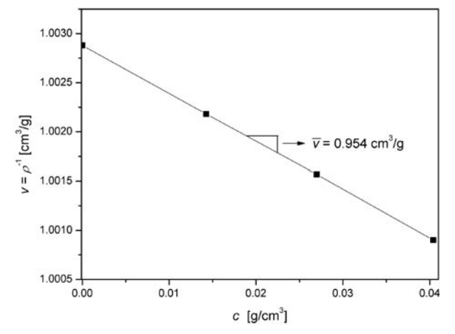 The best way to measure PSV is by using the Kratky density balance. For the pure solvent and for three solutions with different concentrations of the solute, the absolute densities can be measured. The PSV, the reciprocal of density, can be plotted as a function of concentration, \(c\).The slope of a regression line will yield the PSV of the solute.