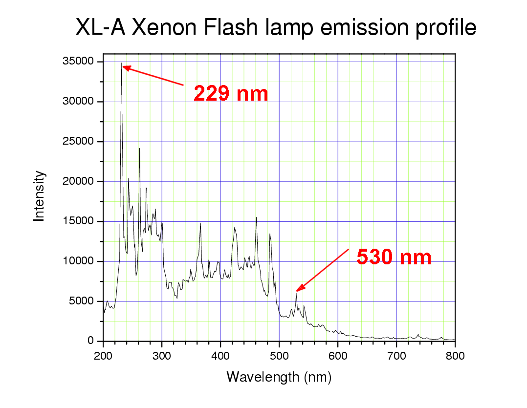 To measure the XENON LAMP EMISSION PROFILE, run an intensity wavelength scan over the dynamic range of the instrument on an empty hole at 6.5 cm. Rotor speed is irrelavent; it is commonly set to 3,000 rpm. You should see a profile similar to the one above, with a peak intensity at 230 nm of at least 15,000 counts. If the intensity is much less than this, clean the lamp, or call for Beckman Services to check the optical system, mirror, PMT, and/or powersupply. If you want to attempt to clean the lamp yourself, and the count is still lower than 15,000 counts, the lamp may need to be aligned. For the XL-A: rotate the lamp in the lamp housing and repeat the intensity scan. Repeat for one full turn, identifying the position that produces the highest intensity. Verify that this is reproducible across every position in the cell.