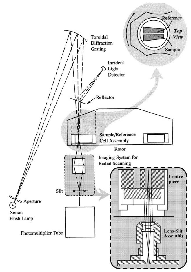 The absorbance optics in the Beckman Coulter AUCs use high-intensity xenon flash lamps that allow for the use of wavelengths ranging from 190 nm to 800 nm. The lamp is fired briefly as the sector passes the detector. A slit below the sample allows for samling of different radial positions. Multiple readings at the same position can be collected and averaged, minimizing noise. The triggering of the lamp is based on the exact measurement of the actual rotor speed, which is realized by a Hall-effect sensing devices based on the over-speed disk on the bottom of the rotor. As the over-speed disk passes a sensing device, an electrical signal is induced. The position of the cell, and that of the cell sector, can then be determined. The duration of a single fash is about 2 -3 \(\mu\)s, and with a maximum shot frequency of 100 Hz, the flash lamp can flash every ten revolutions at the maximum speed of 60,000 rpm.