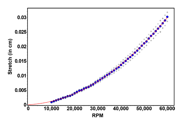 \(\textbf{Figure 2}\) Rotor stretching data for an AN60Ti rotor between 10,000 RPM and 60,000 RPM (blue), fitted to a second order polynomial (red). The black crosses represent the standard deviation.