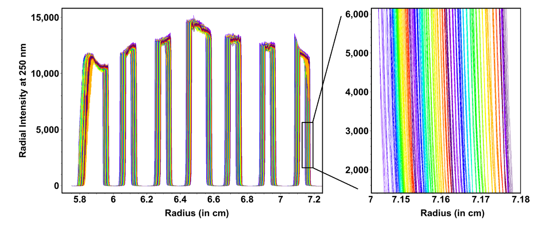 \(\textbf{Figure 1}\) Intensity rotor stretch data collected from a calibration disk from an An-60 rotor, 0-60,000 rpm in 1,000 rpm steps.