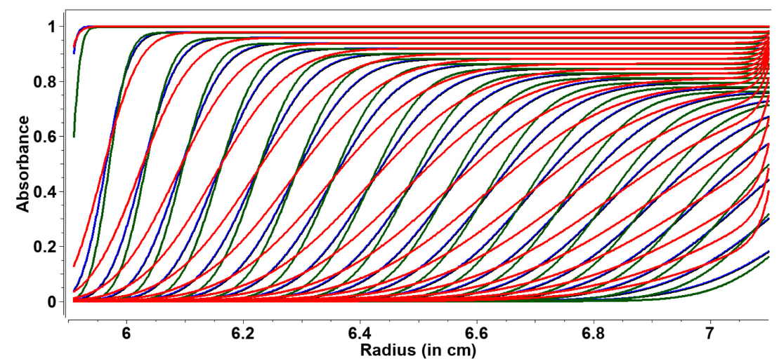 The duration and speed combinations shown above allow for the same amount of cumulative centrifugal force on the species, but the diffusion information is more significant at lower speeds. This is represented by the shallower traces (in red) and the increased back-diffusion affect on the boundary shape.