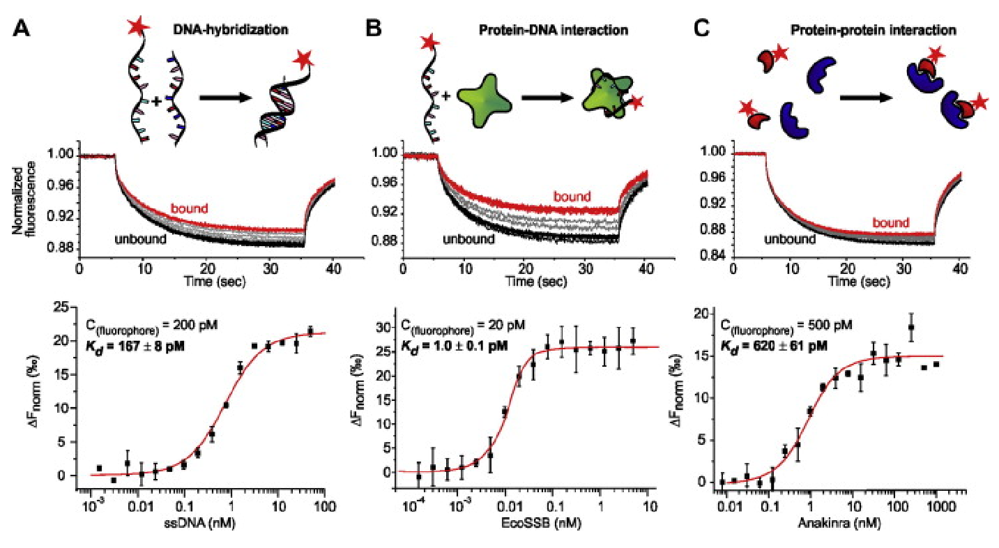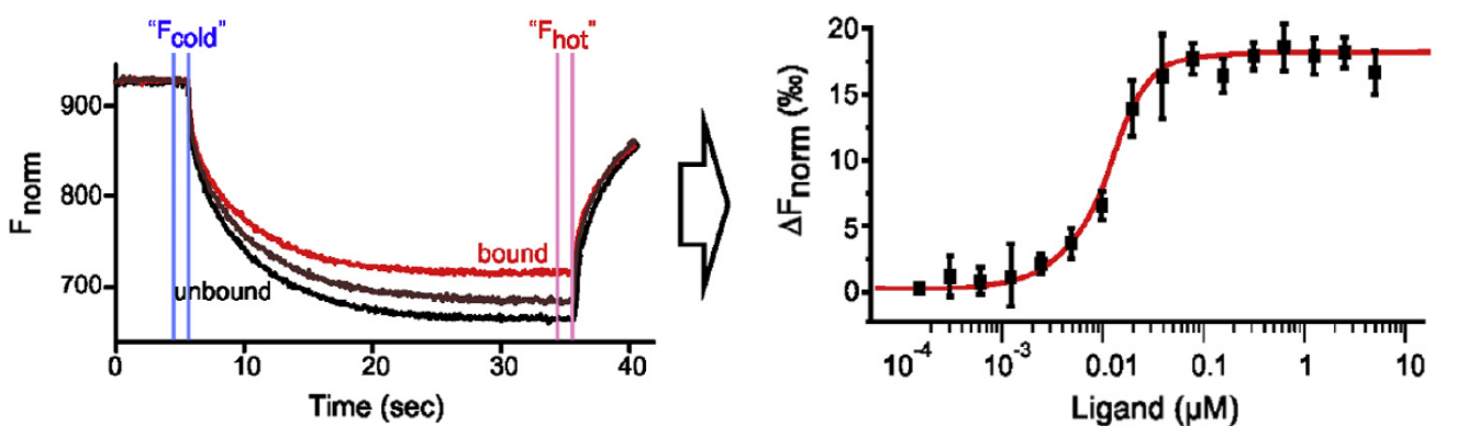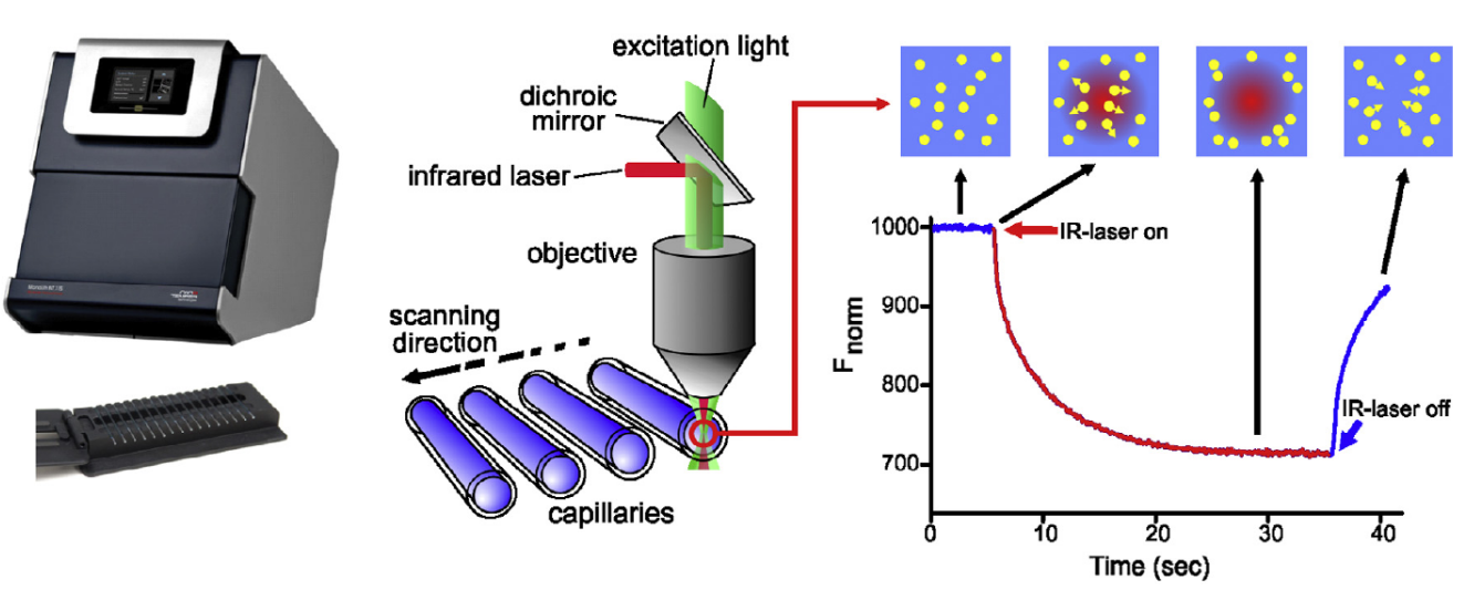 An obserbable in a microscale thermophoresis experiment is the decrease of fluorescence from either the Temperature Related Temperture Change (TRIC) or from the thermophoresis of the fluoresncently tagged molecules.
